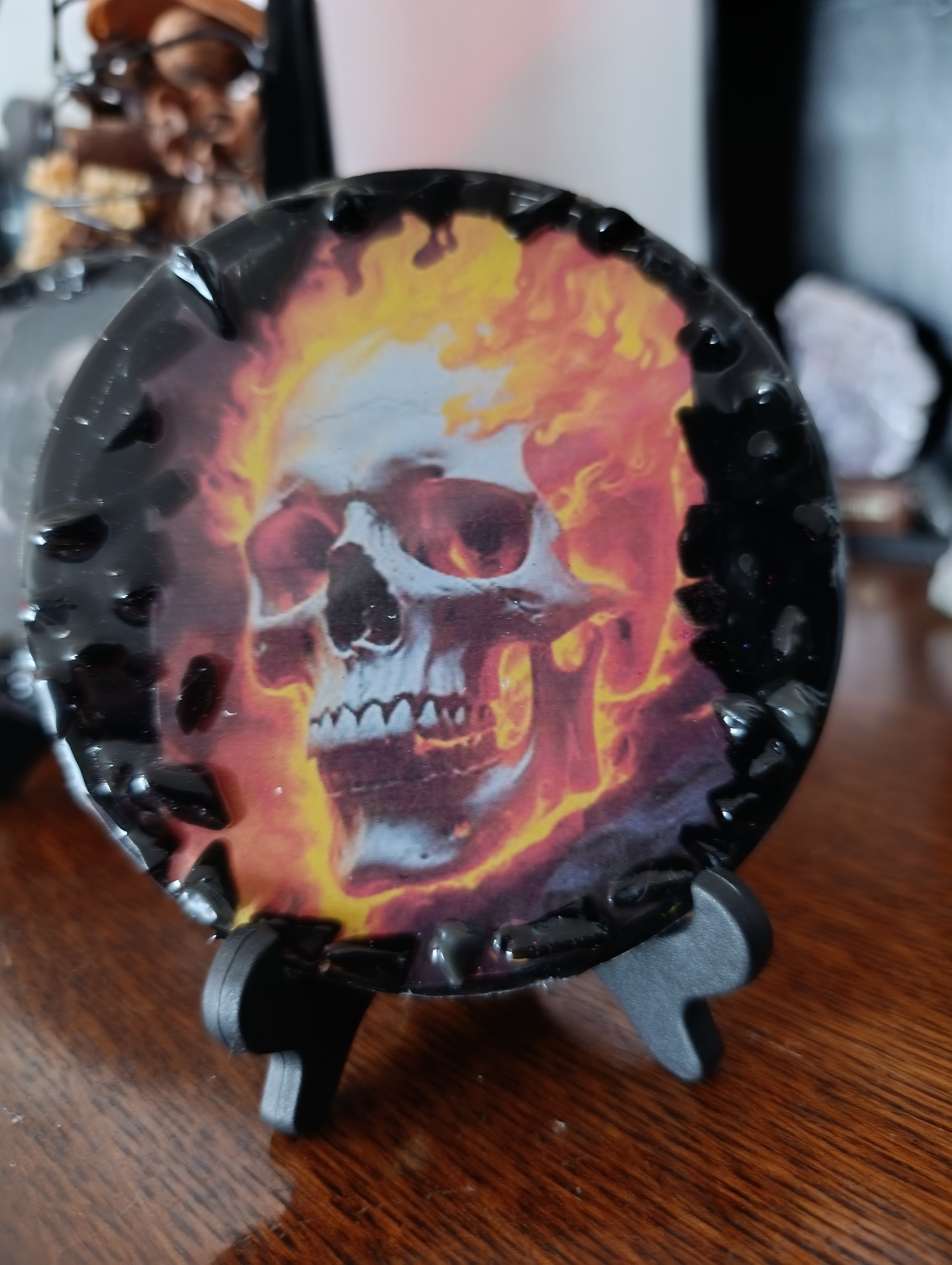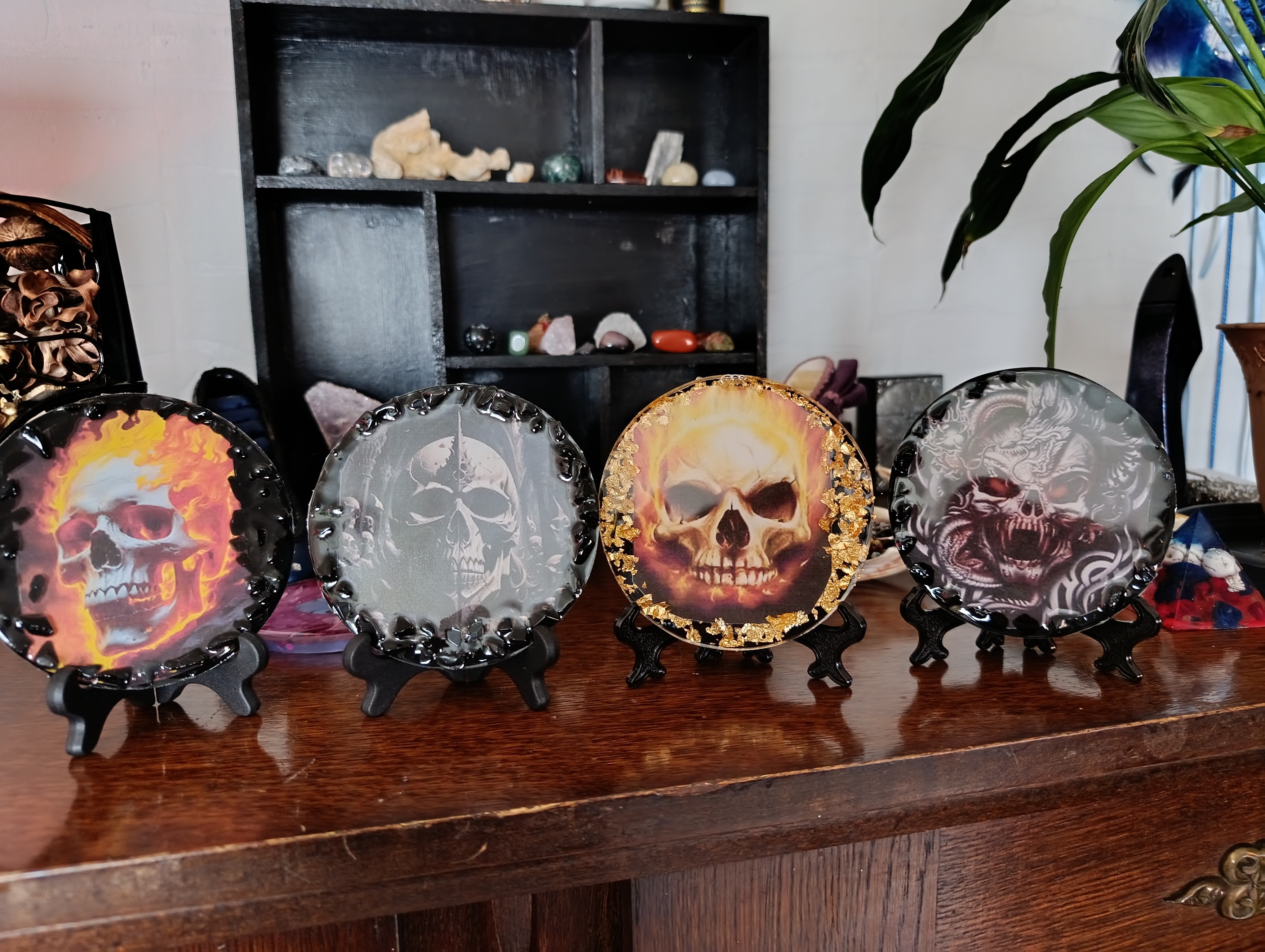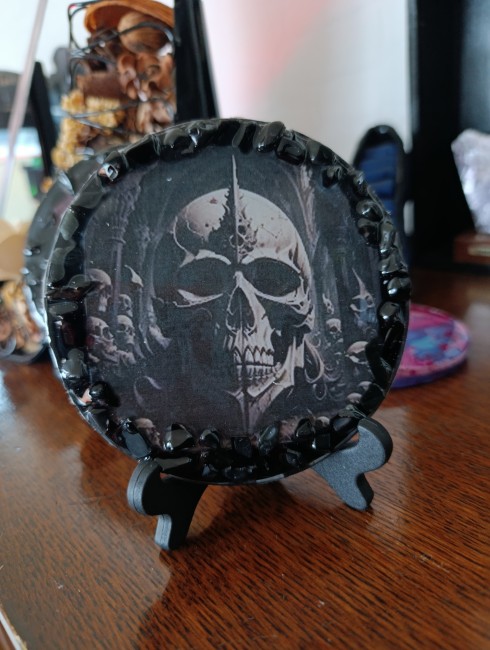 Petitd cadres ou dessous de verre skull en résine avec pierres obsidienne noir incrusté,ou feuilles d'or.